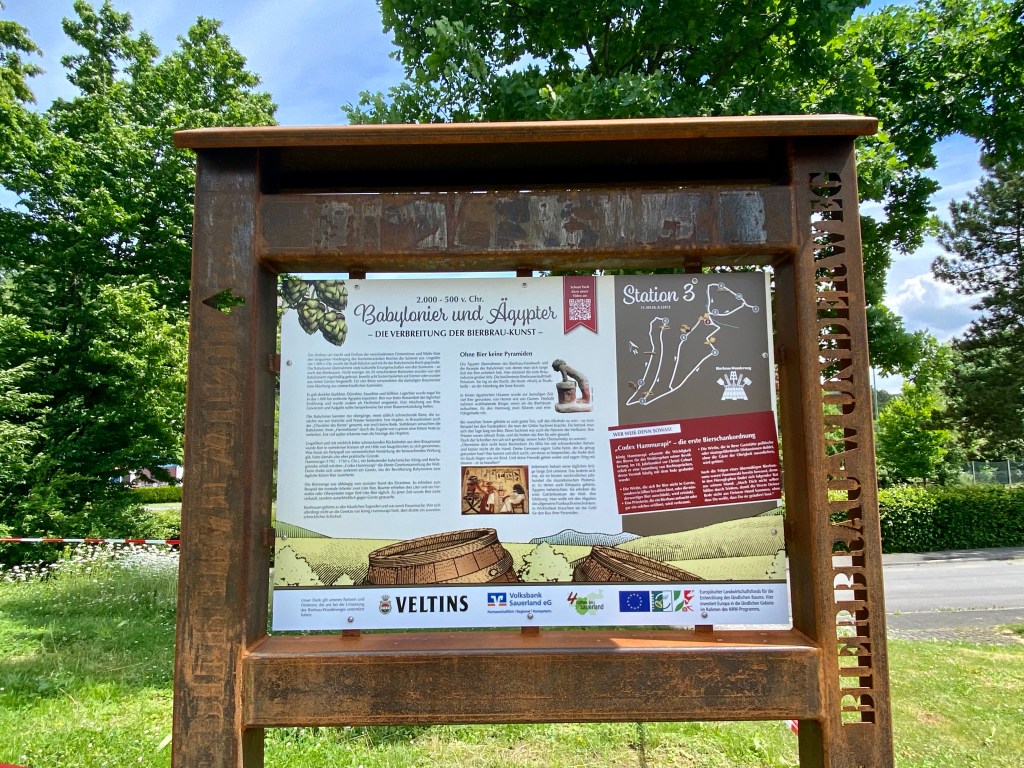 Lange schon deuteten die ersten stählernen Wegweiser es an, aber Corona verzögerte auch seine Vollendung: Seit Anfang Juli ist er nun aber eröffnet, der Bierbrau-Wunderweg in Grevenstein! Der natürlich vor allem von der ortsansässigen Veltins-Brauerei maßgeblich gesponserte Weg führt direkt an der Villa Baldur vorbei (ein Wegweiser steht sogar auf unserem Grundstück) und vermittelt auf 10 aufwändigen Infotafeln und etlichen, ganz besonders gestalteten Rastplätzen einen ganz neuen Zugang zum Thema Bierbrauen und -genießen. Unbedingt erlebenswert!